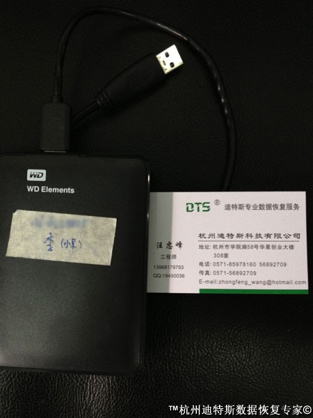 【我们杭州迪特斯数据恢复专家接到原来西溪数码港老客户的电话,描述他们的一个朋友的西数1TB的原装移动硬盘摔了一下盘符打不开了,里面是儿子出国的重要数据,需要恢复】我们杭州迪特斯数据恢复专家接到杭州西溪数码港的一个老客户的电话,描述他的一个朋友的一个西数WD Elements的原装1TB的移动硬盘摔了一下之后,就无法识别了,我们一般的数据恢复工程师听到这样的描述按照道理来说,基本上可能是硬盘磁头损坏引起的,因为硬盘一摔基本上跟磁头损坏是很有关系的,因为这是是根据用户的描述我们得出的一个结果,可能需要硬盘开盘的情况,按照我们杭州迪特斯数据恢复专家流程是这样子的,用户描述的情况只能大概判断,详细正确的判断是需要损坏的硬盘拿过来做详细的检测,第一跟客户有个交代,第二我们杭州迪特斯数据恢复专家是负责任的一个公司。于是还是让用户将移动硬盘拿过来进行检测。